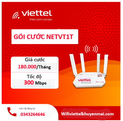 - Giờ đây việc sở hữu một đường truyền wifi Viettel tốc độ cao lên đến 300 Mbps/s không còn là mơ ước mà đã trở thành hiện thực với gói cước Netvt1T chỉ với giá 180000 đồng/tháng.